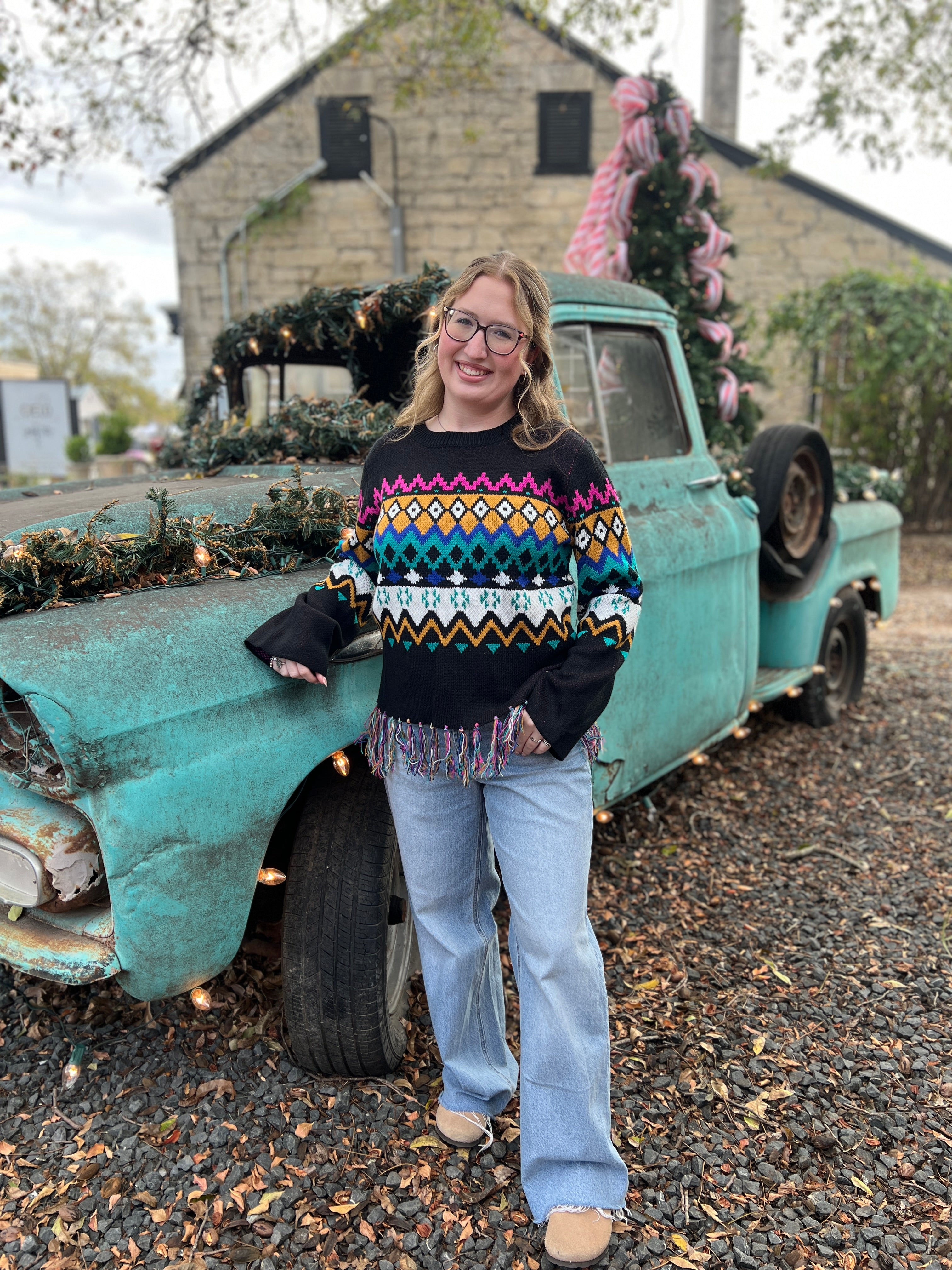 Brighten your wardrobe with the Agarita Sweater, a playful knit that brings instant personality to any outfit. Featuring a bold geometric design in a vibrant pop of color, this piece strikes the perfect balance between fun and wearable. The frayed hem adds a relaxed, effortless edge that keeps things from feeling too polished. Layer it over basics or wear it solo for a statement-making look that celebrates your unique style.