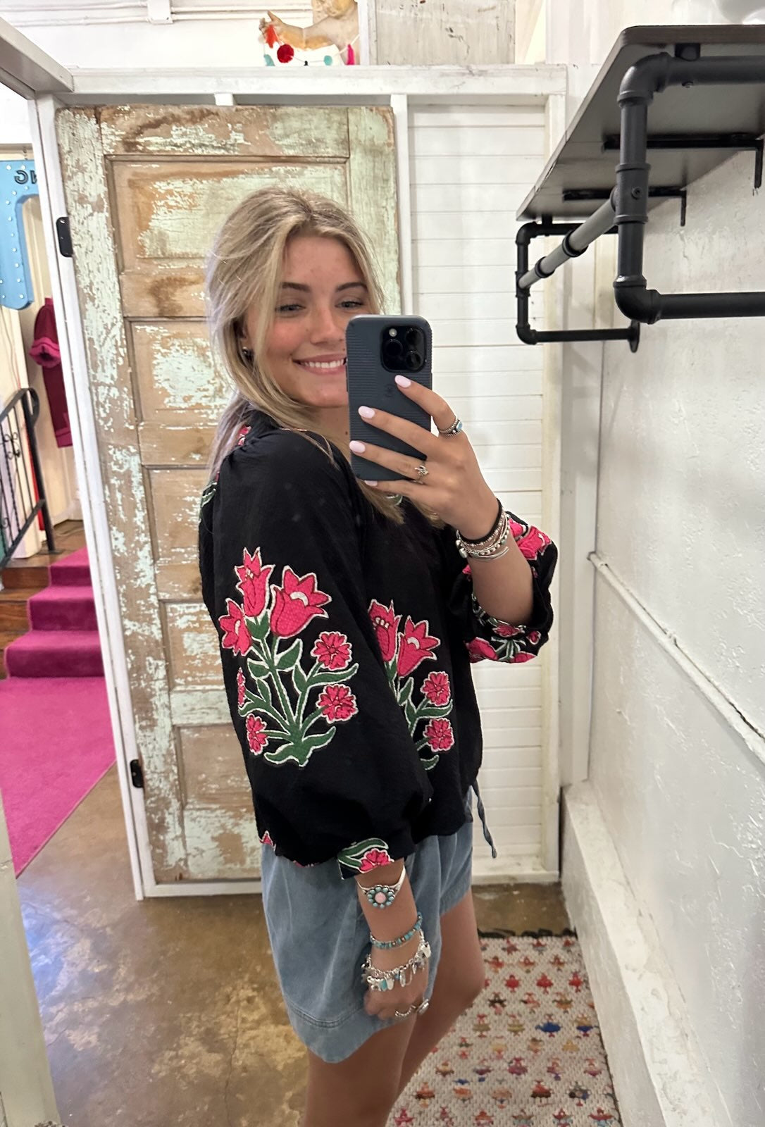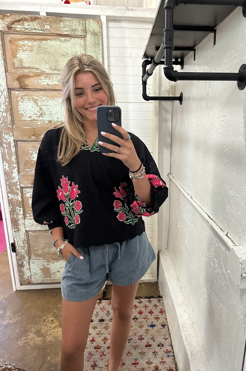 Add a little fun to your wardrobe with our Eliana Top! This black top features a unique blue and pink floral design, a mock collar, and a playful v-neck. Plus, the puff sleeves add a touch of whimsy to any outfit! (Only available in black, but who needs anything else?!)