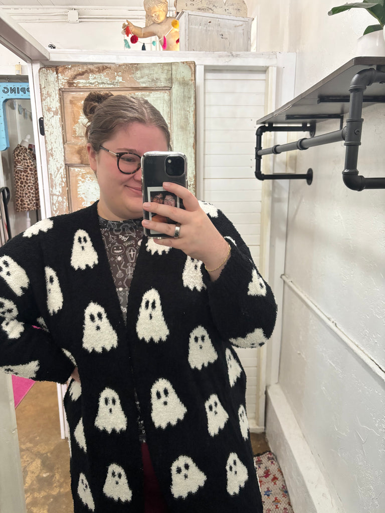 Unleash your playful spirit with our Ghost Cardigan! Made from soft, cloud-like fabric, this reversible cardigan is both cozy and stylish. The black and white design features a fun ghost pattern, adding a touch of quirkiness to any outfit. Get ready to haunt the fashion scene!