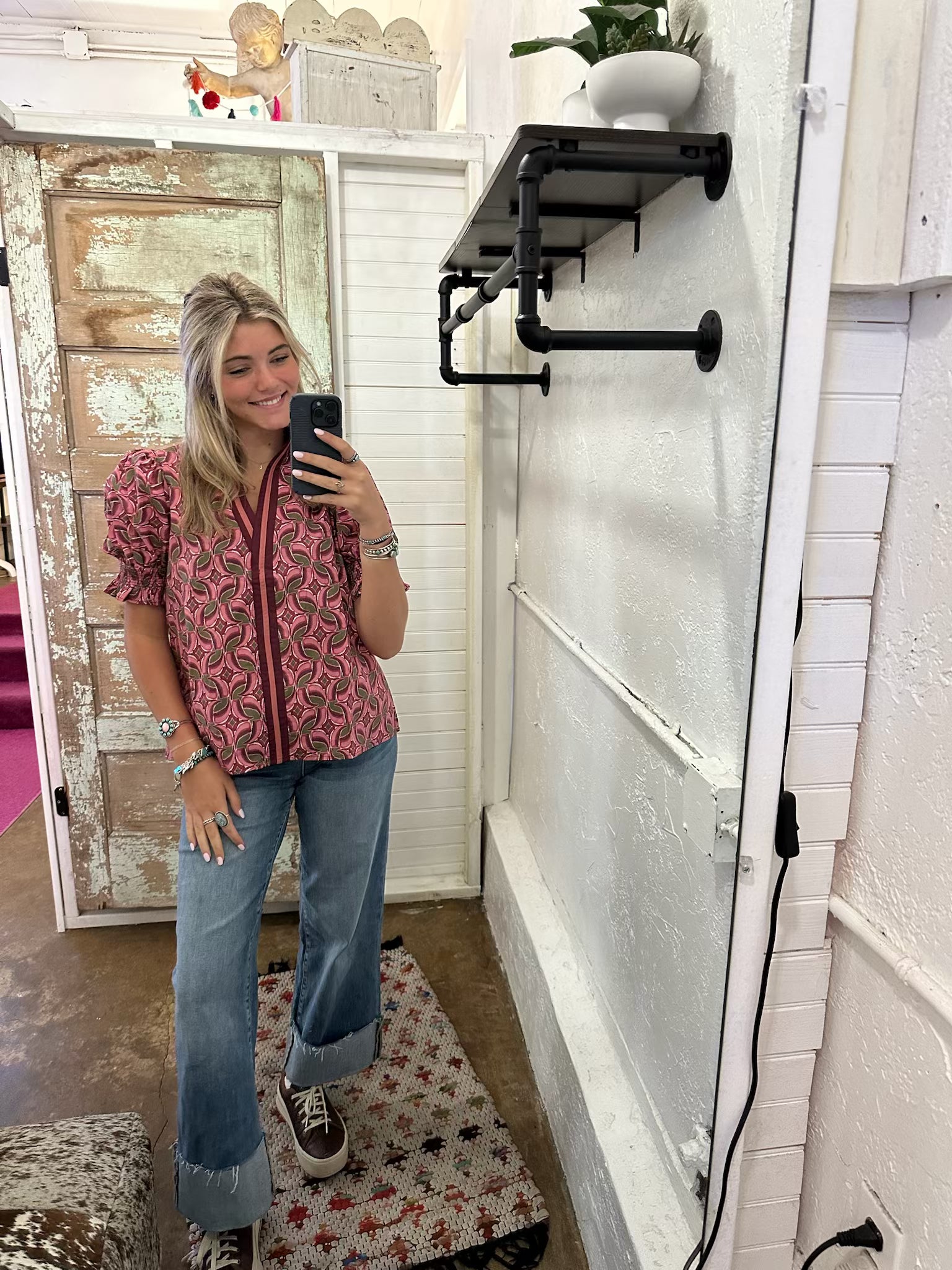 The Laurie Top is a playful and eye-catching top in a rich burgundy color, perfect for the upcoming fall season. With a stylish V-neck and high neck detail, this short sleeve top is both trendy and versatile. Make a statement and rock the fall colors in this unique top!