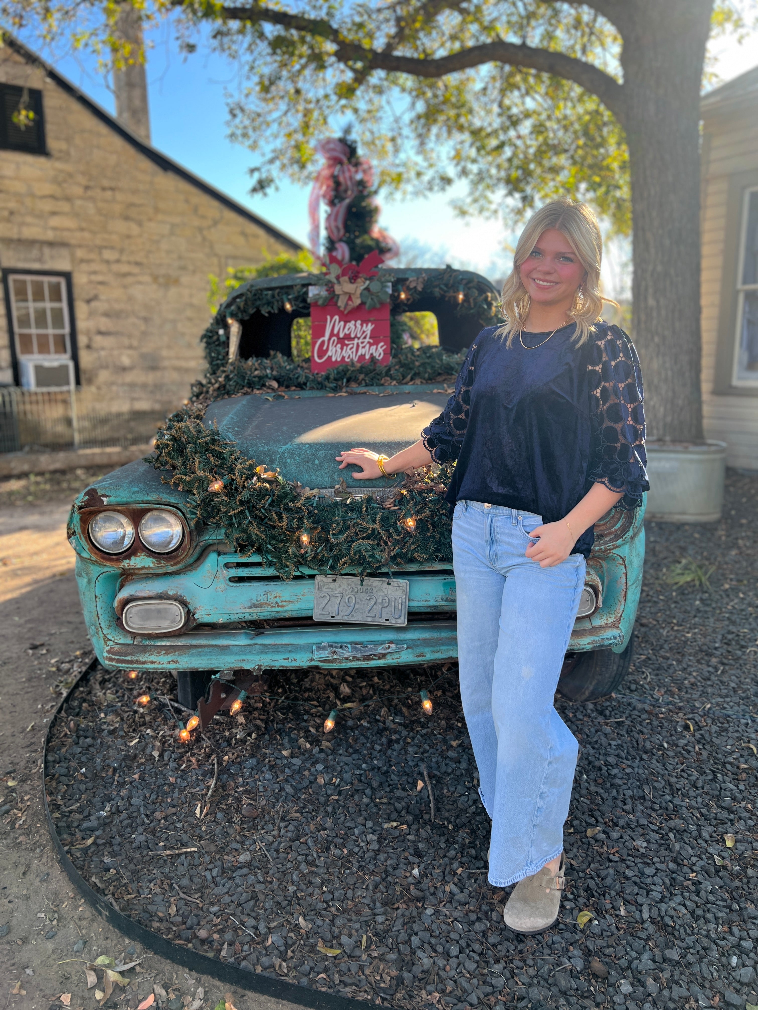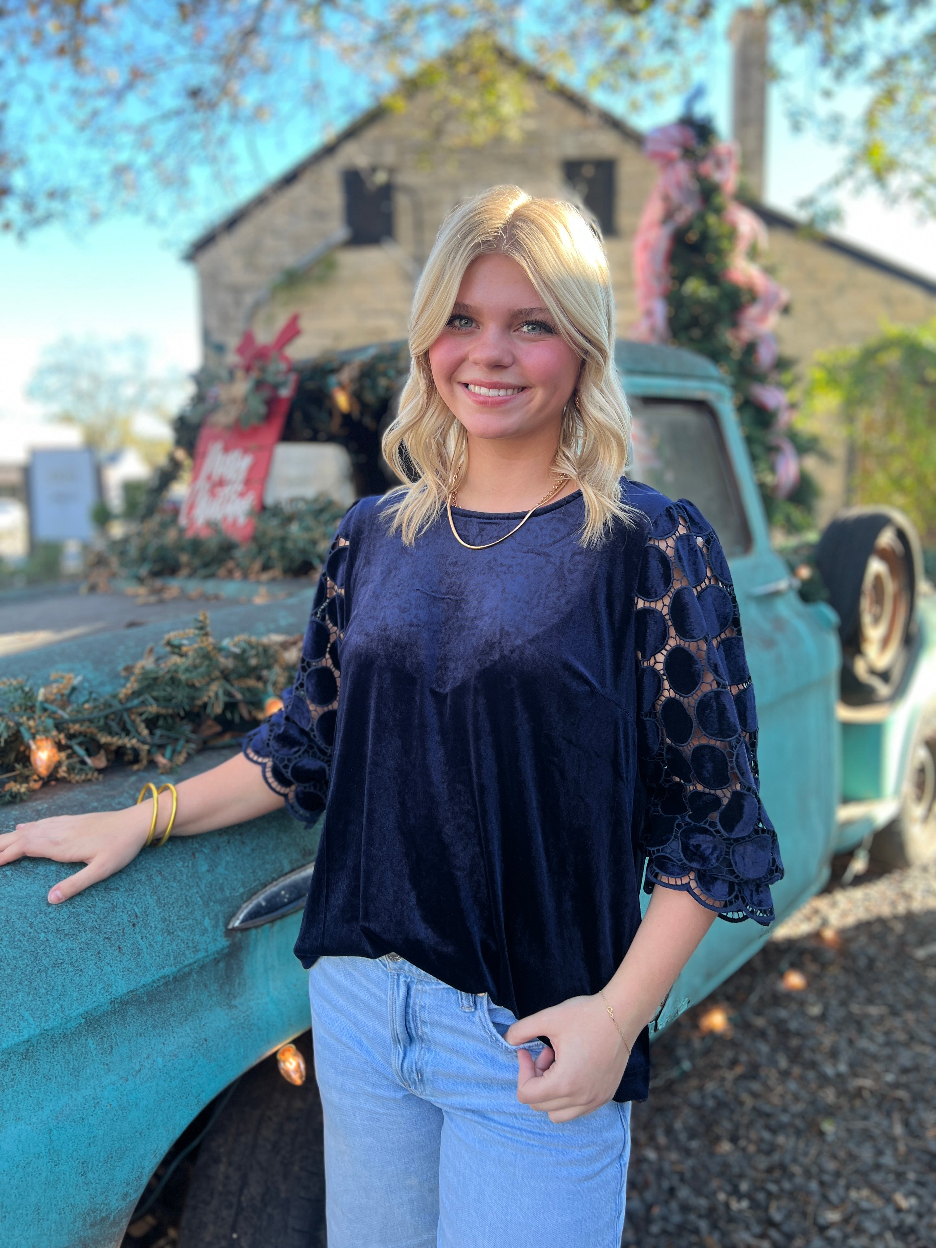 Stay cozy and chic with our Leander Top! Made with soft velvet and a trendy burnout sleeve, this round neck top is the perfect addition to your holiday wardrobe. Dress it up or down for any occasion.